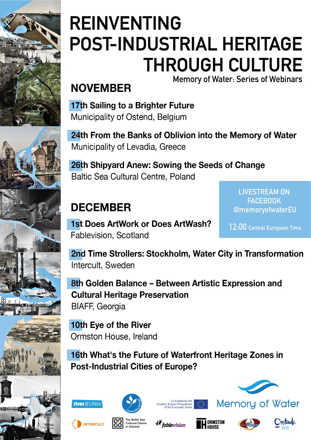 Memory of Water Introducing a Grand Finale programme of webinars that will profile the achievements of six partner cities striving to impact the future of post industrial cultural heritage on the European waterfronts by looking at those places with the eyes of socially engaged, interventionist artists.
